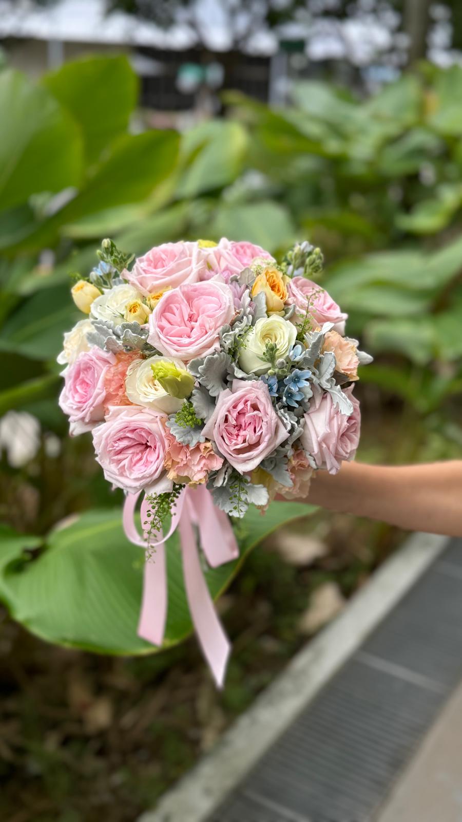 This bridal bouquet features a stunning combination of pink and champagne-colored roses.
