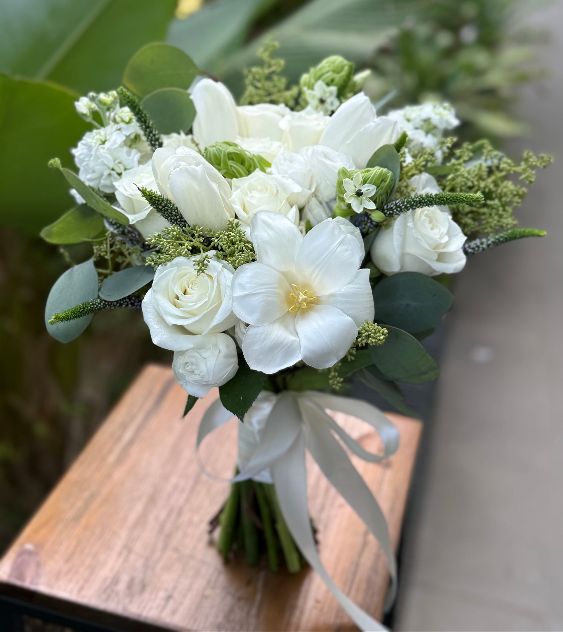 This BB 12 bridal bouquet comes in a delicate and romantic mix white bridal bouquet, perfect for any wedding. Handcrafted by industry experts, each bouquet is made with the highest quality flowers for a stunning and elegant look. Add a touch of charm and sophistication to the bride's ensemble with this gorgeous bouquet.