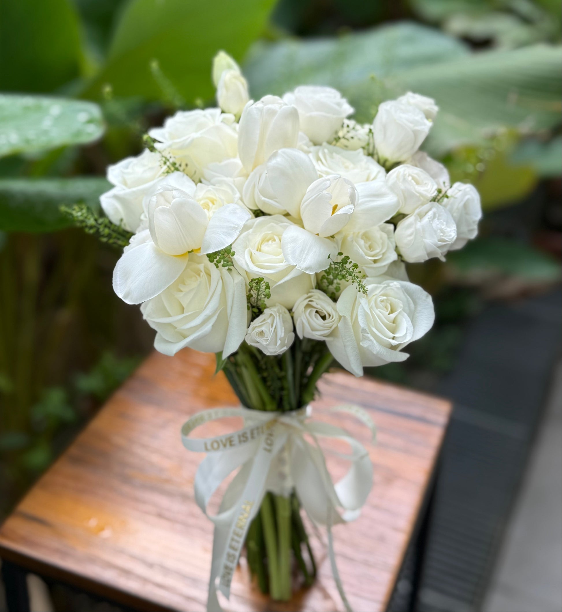 This BB 13 bridal bouquet comes in a delicate and romantic mix white bridal bouquet, perfect for any wedding. Handcrafted by industry experts, each bouquet is made with the highest quality flowers for a stunning and elegant look. Add a touch of charm and sophistication to the bride's ensemble with this gorgeous bouquet.