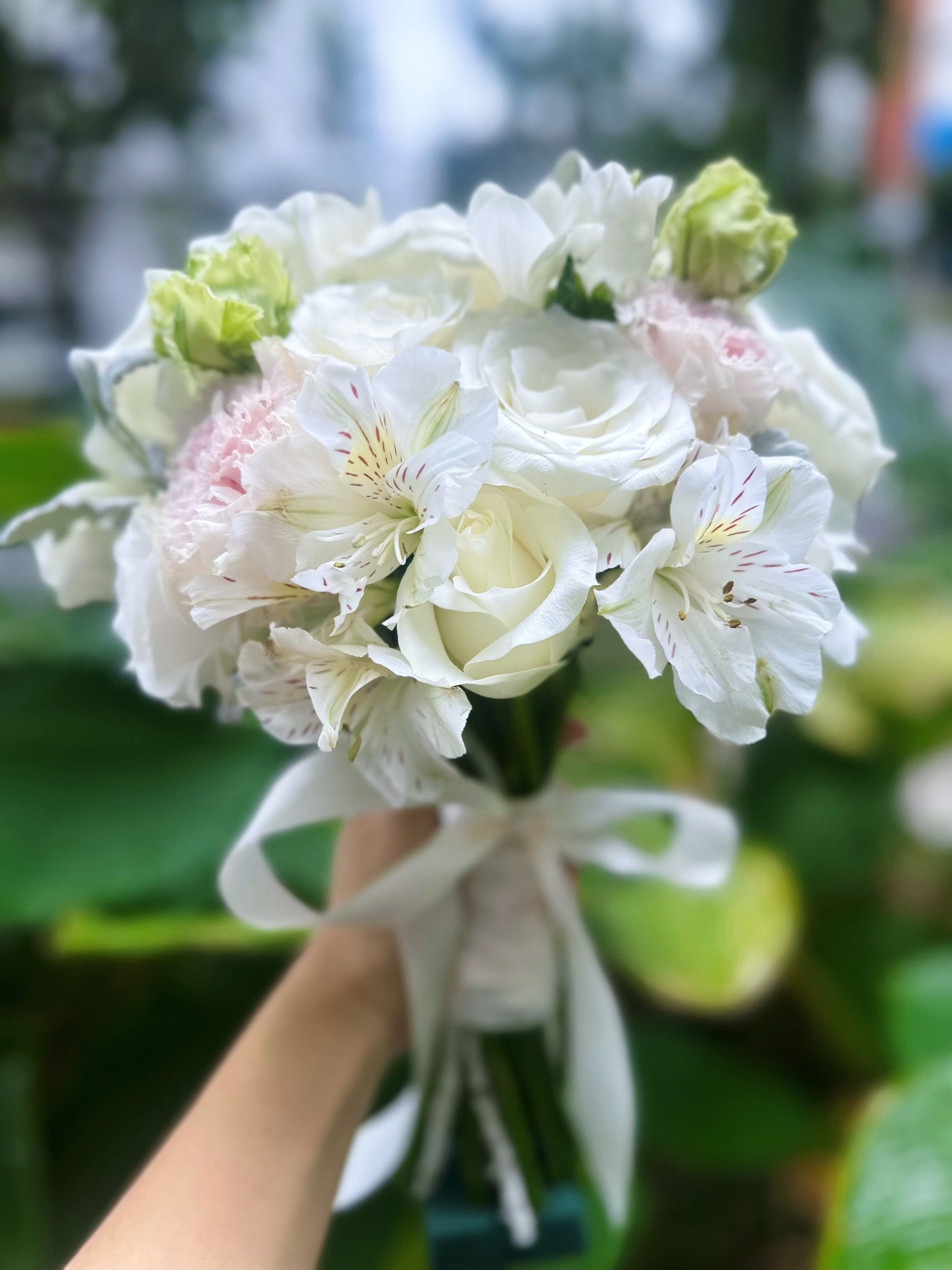 This BB 18 bridal bouquet features a stunning combination of white and pink roses, adding a touch of elegance and romance to your special day. The delicate roses are sure to complement any wedding dress and will make for beautiful wedding photos. Trust in this expertly crafted bouquet for a timeless and classic look.