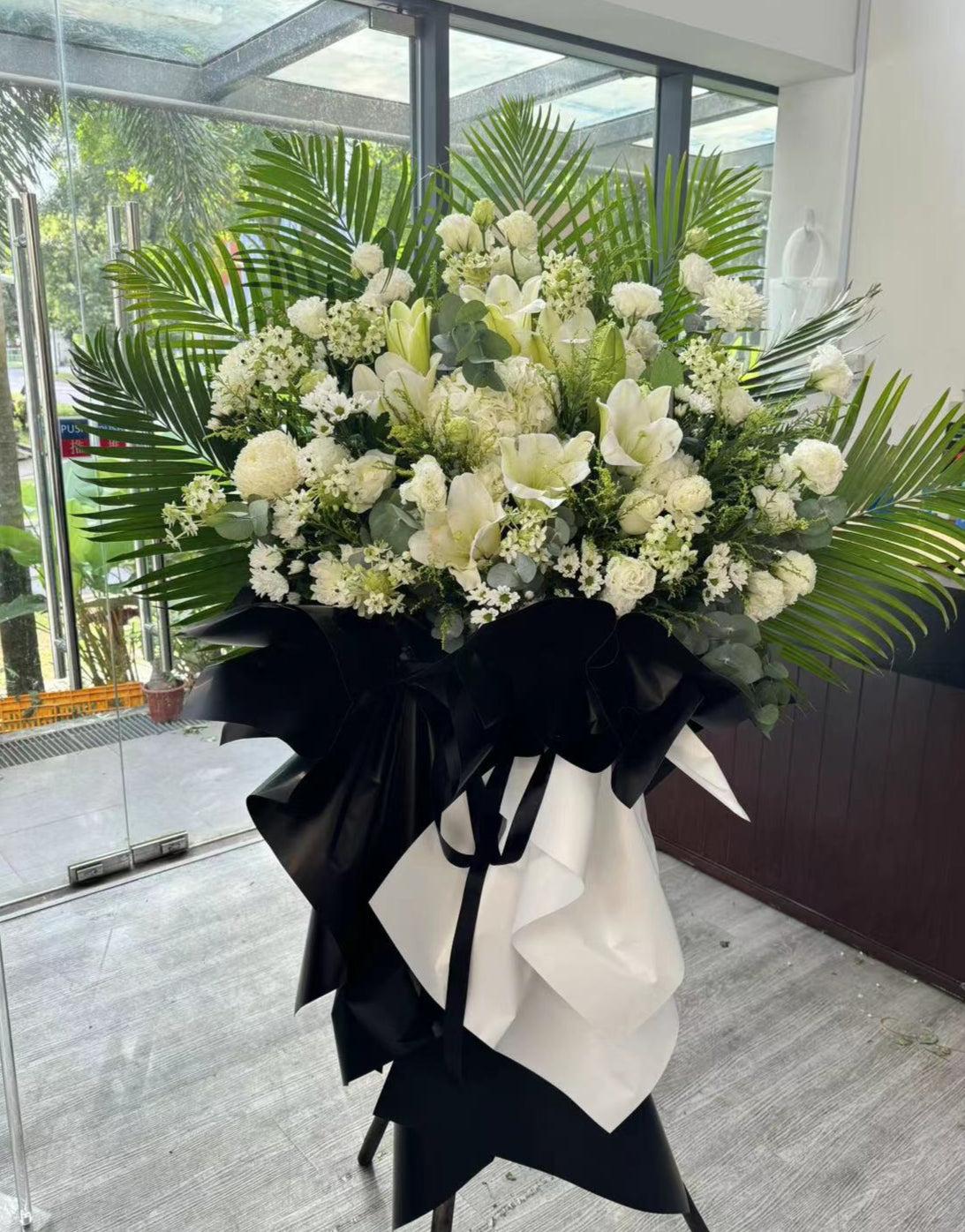 Expertly crafted for solemn occasions, it offers a heartfelt tribute to the memory of a loved one. Made with care and precision, this wreath serves as a dignified gesture of sympathy and support for those grieving. Honor their loss with this beautiful and meaningful tribute.