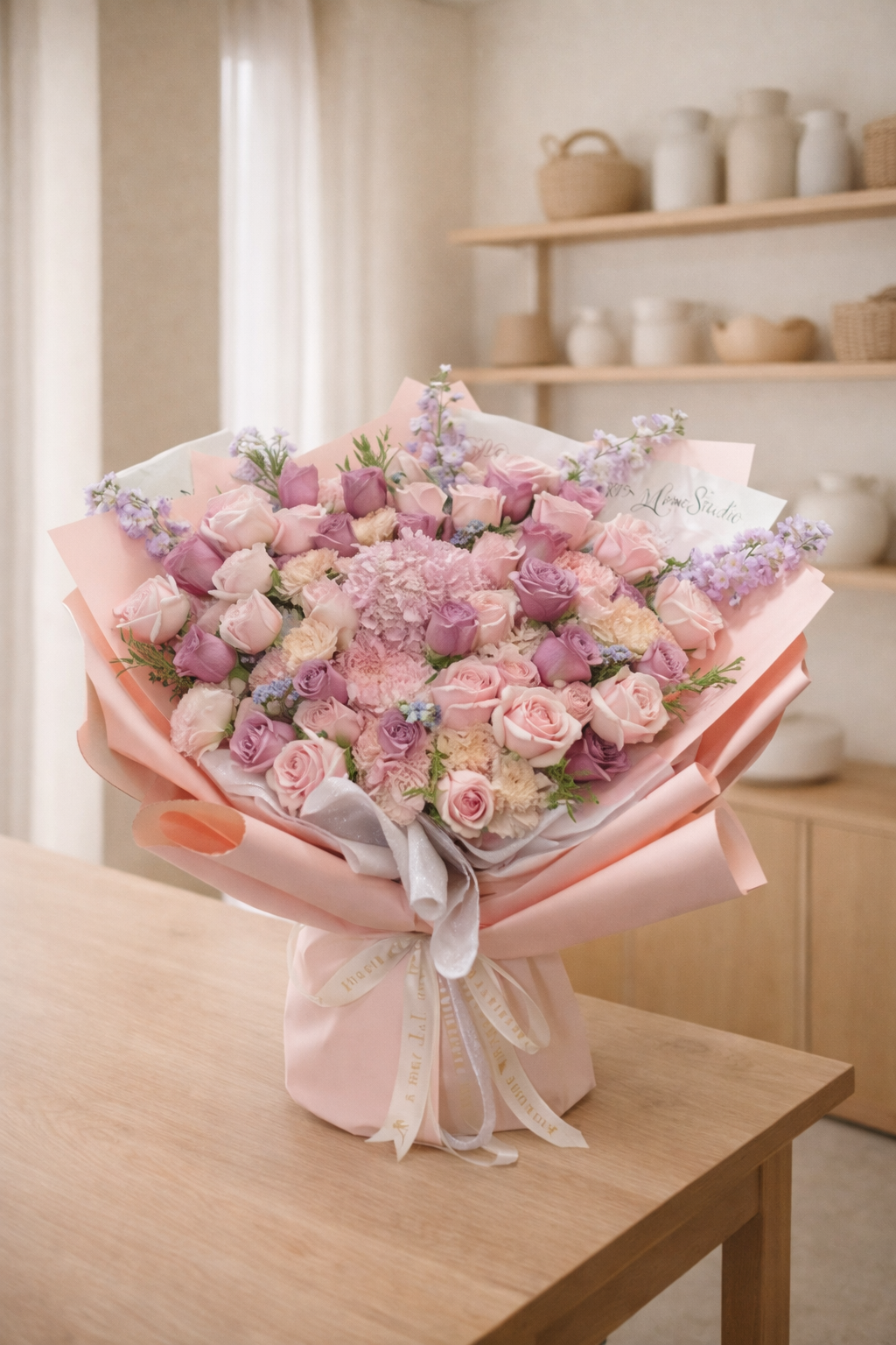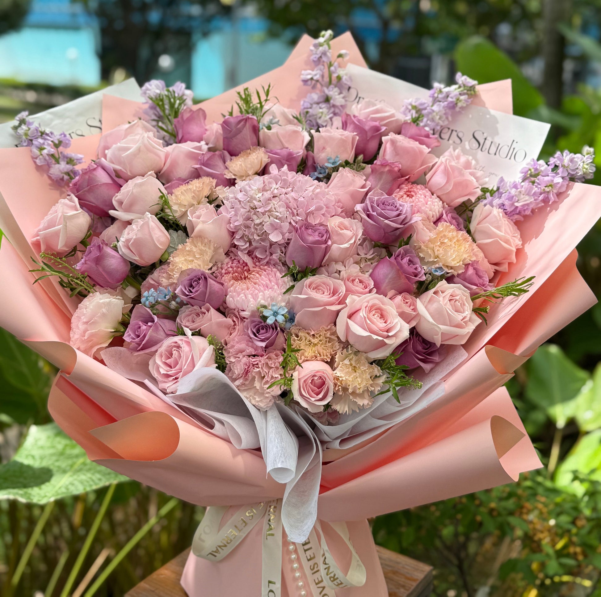 A beautiful bouquet of violet pink mix bouquet, reminiscent of a work of art from an exclusive, high-end gallery.