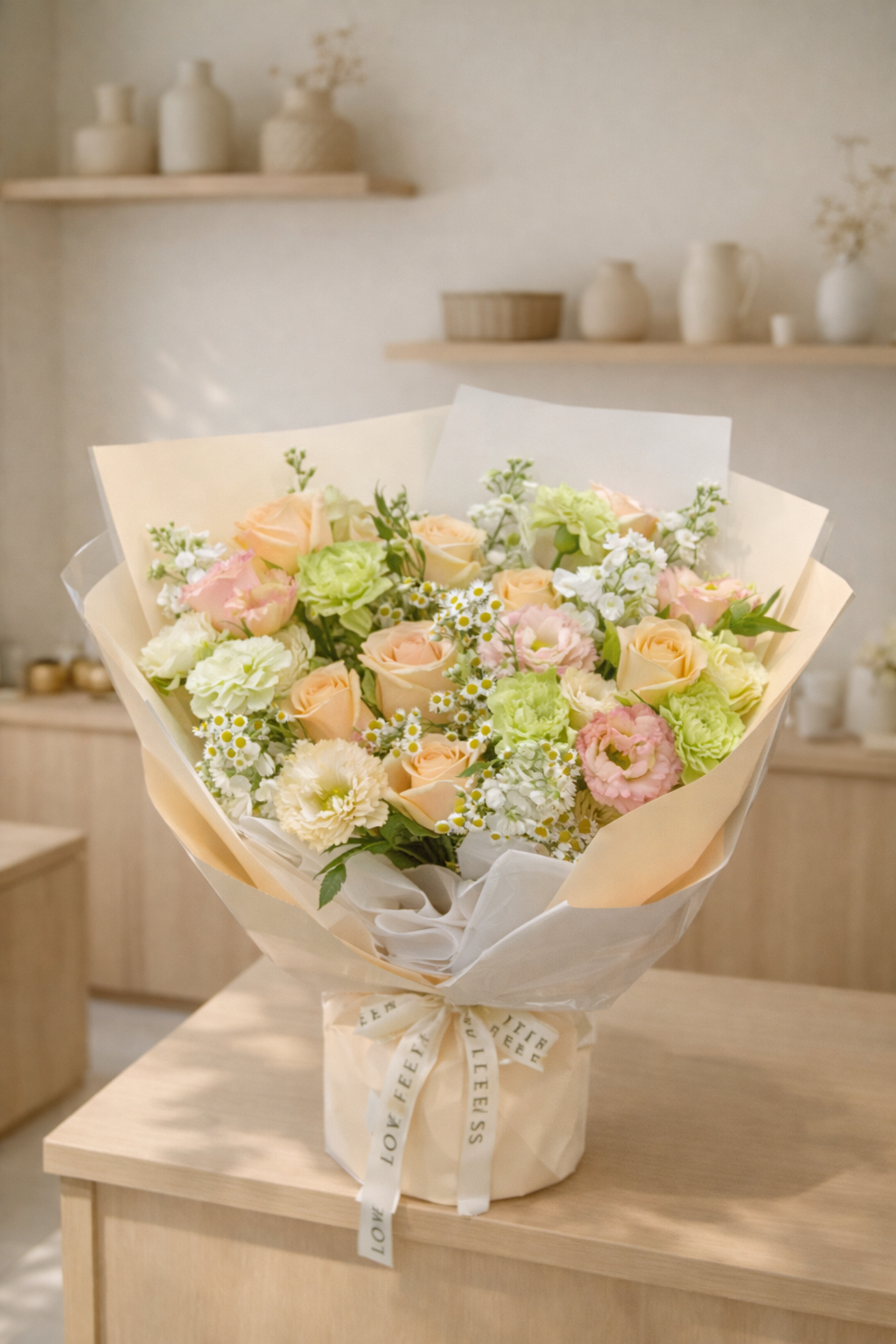 A beautiful bouquet of champagne rose and champagne eustoma bouquet, reminiscent of a work of art from an exclusive, high-end gallery.