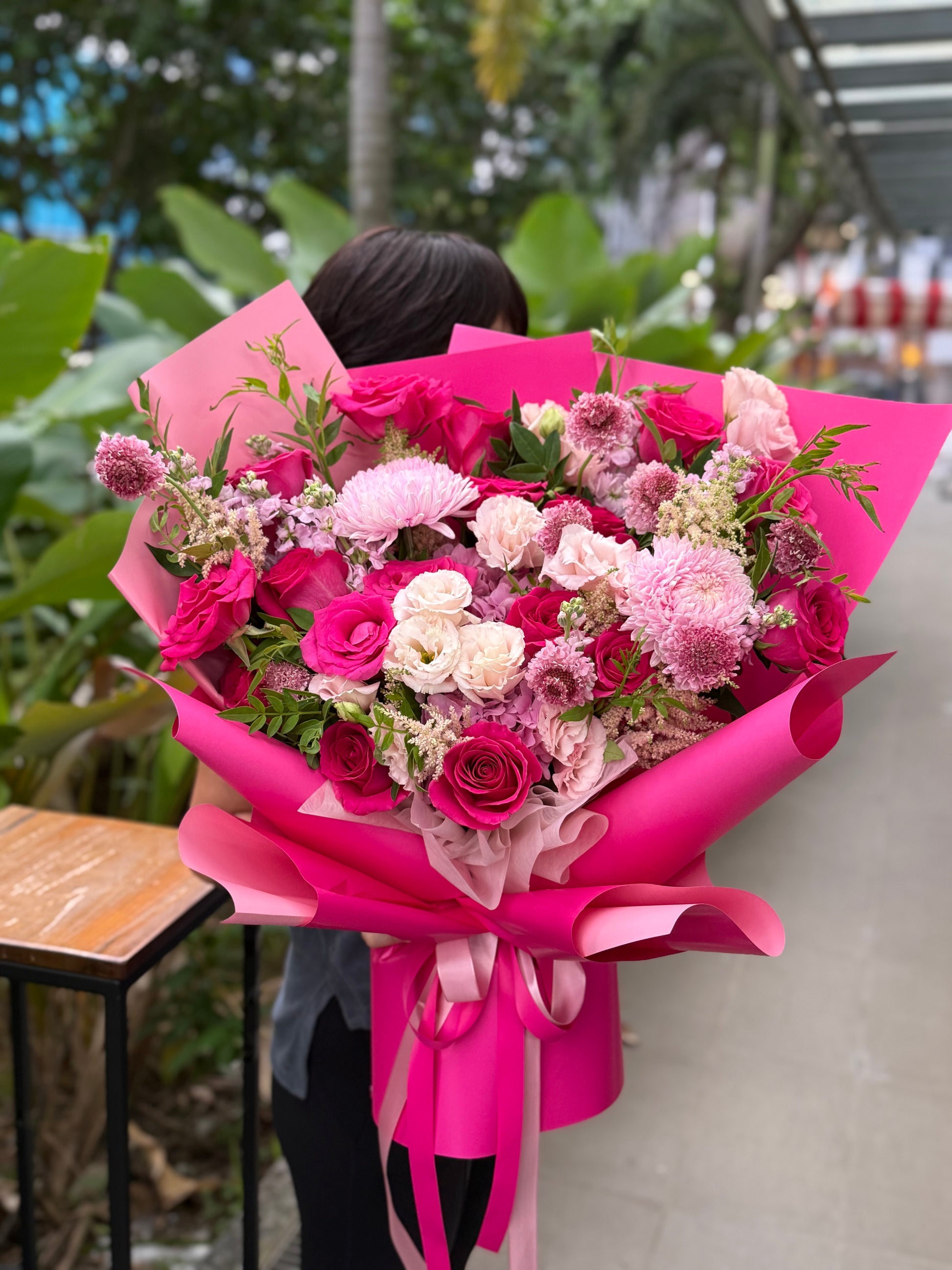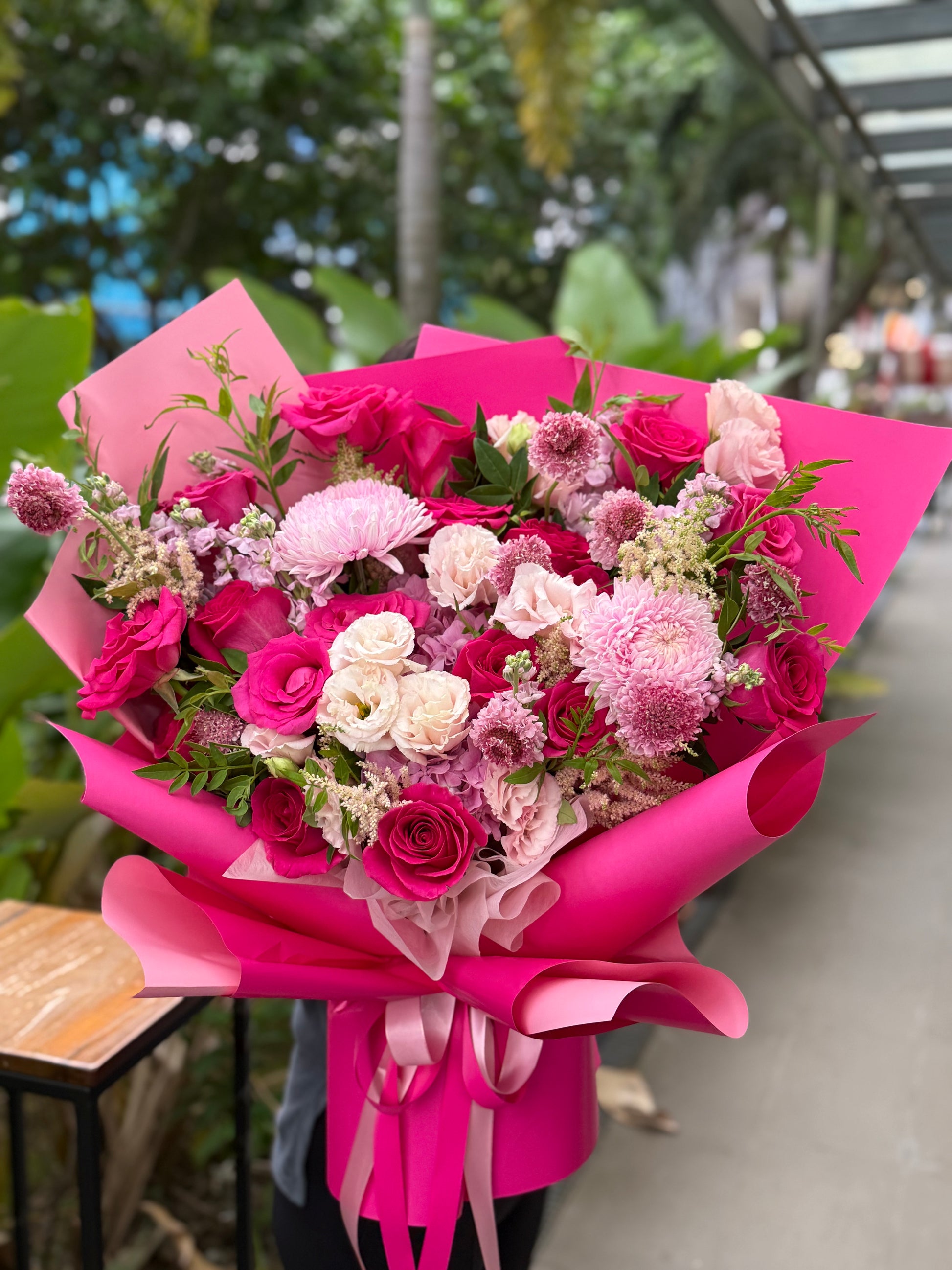 A beautiful bouquet of hot pink rose and pink eustoma bouquet, reminiscent of a work of art from an exclusive, high-end gallery.
