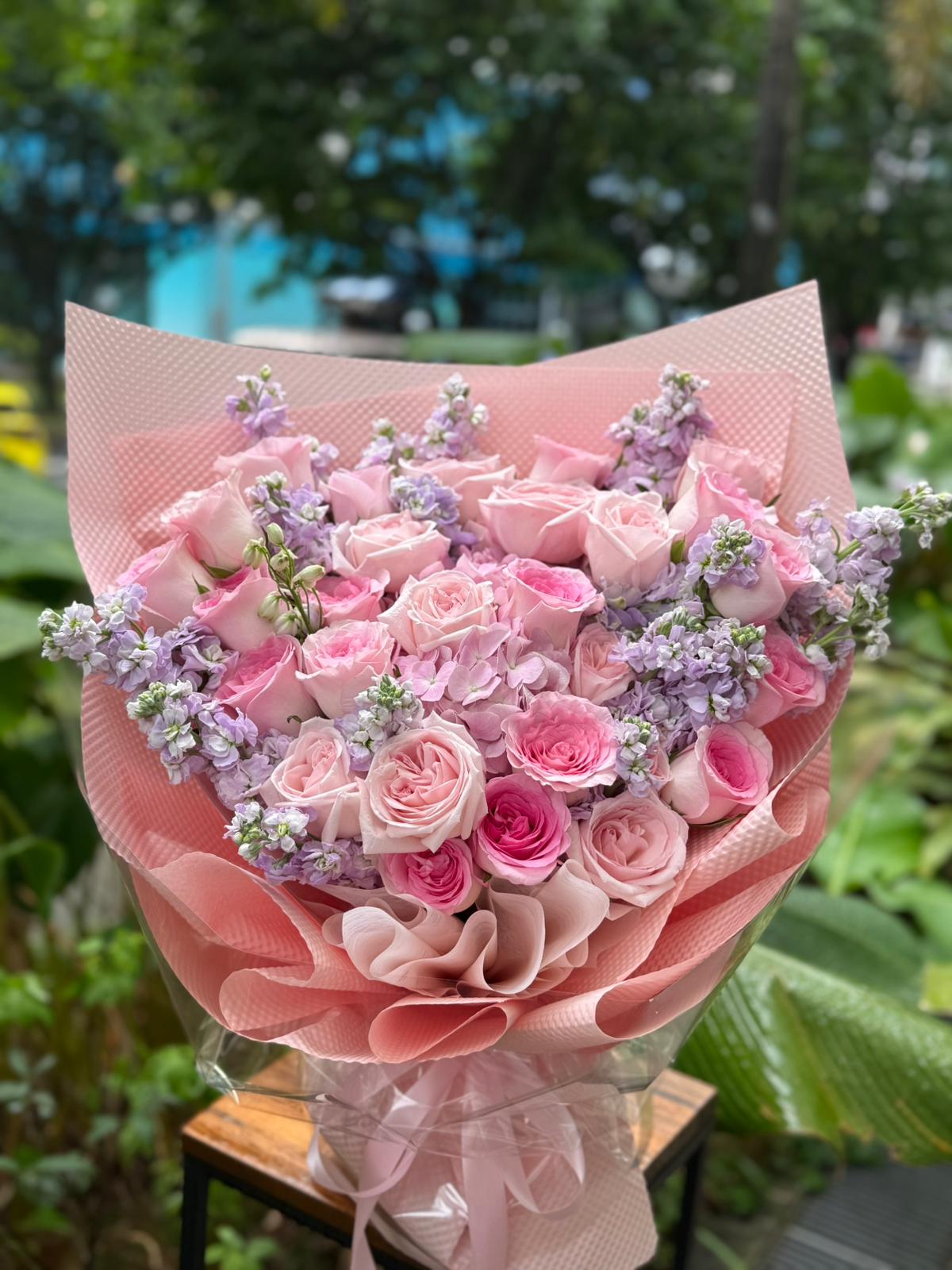 A beautiful bouquet of hot pink rose and pink eustoma bouquet, reminiscent of a work of art from an exclusive, high-end gallery.