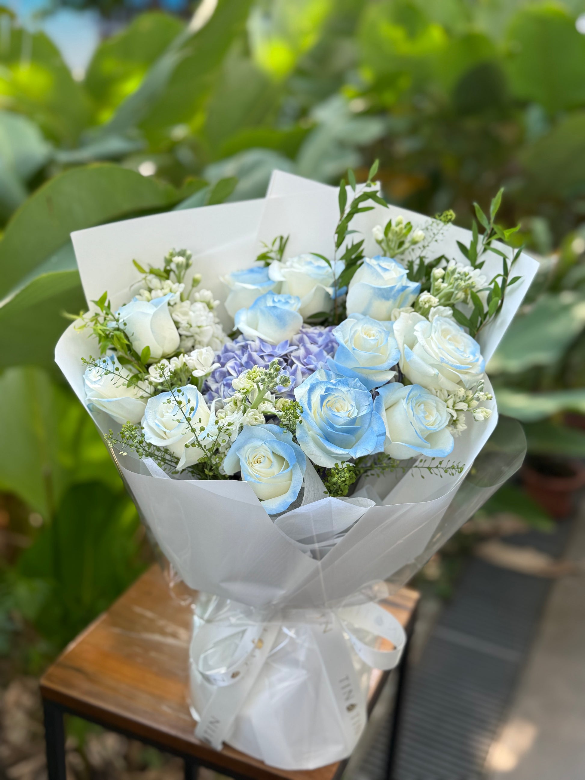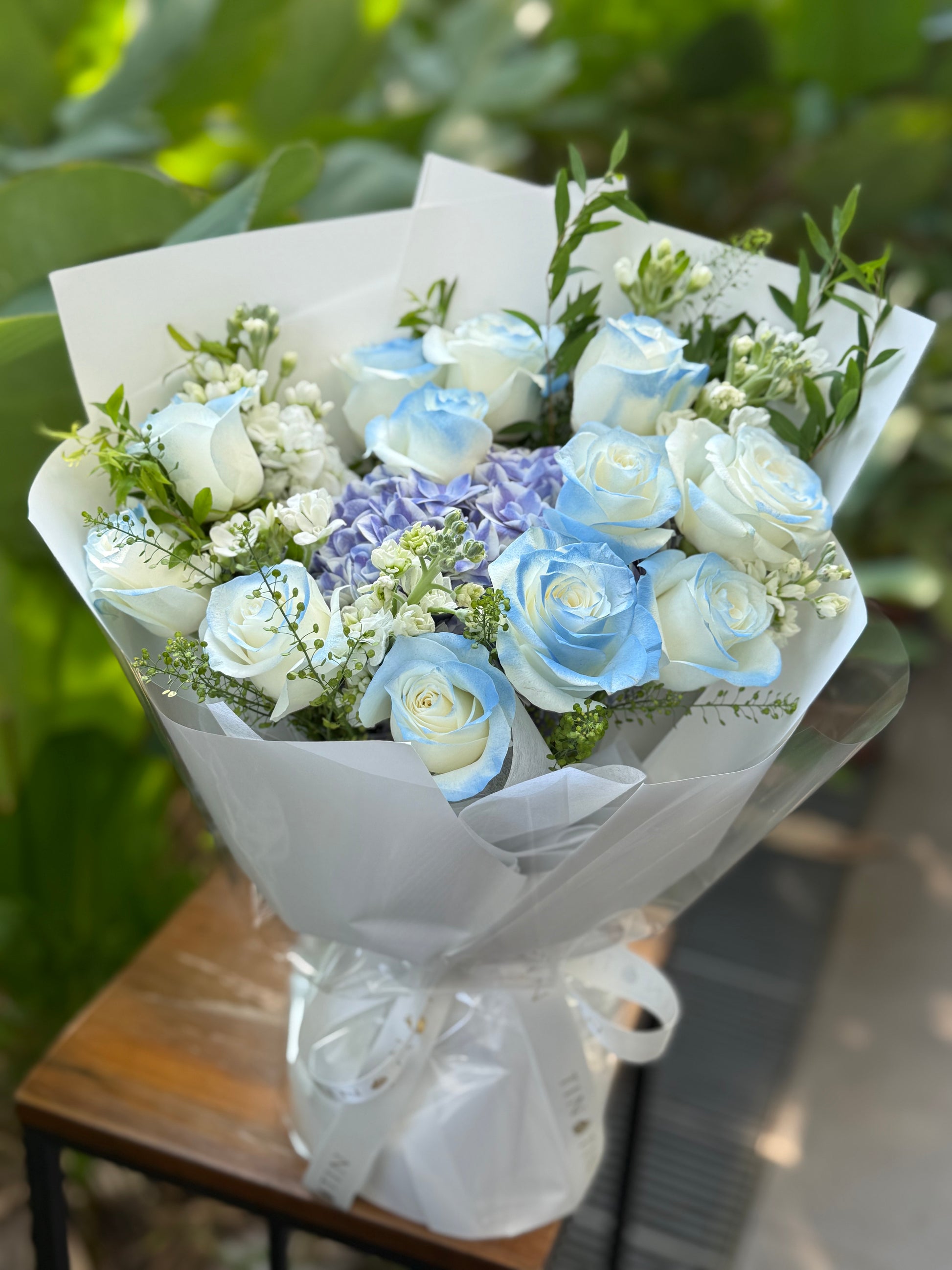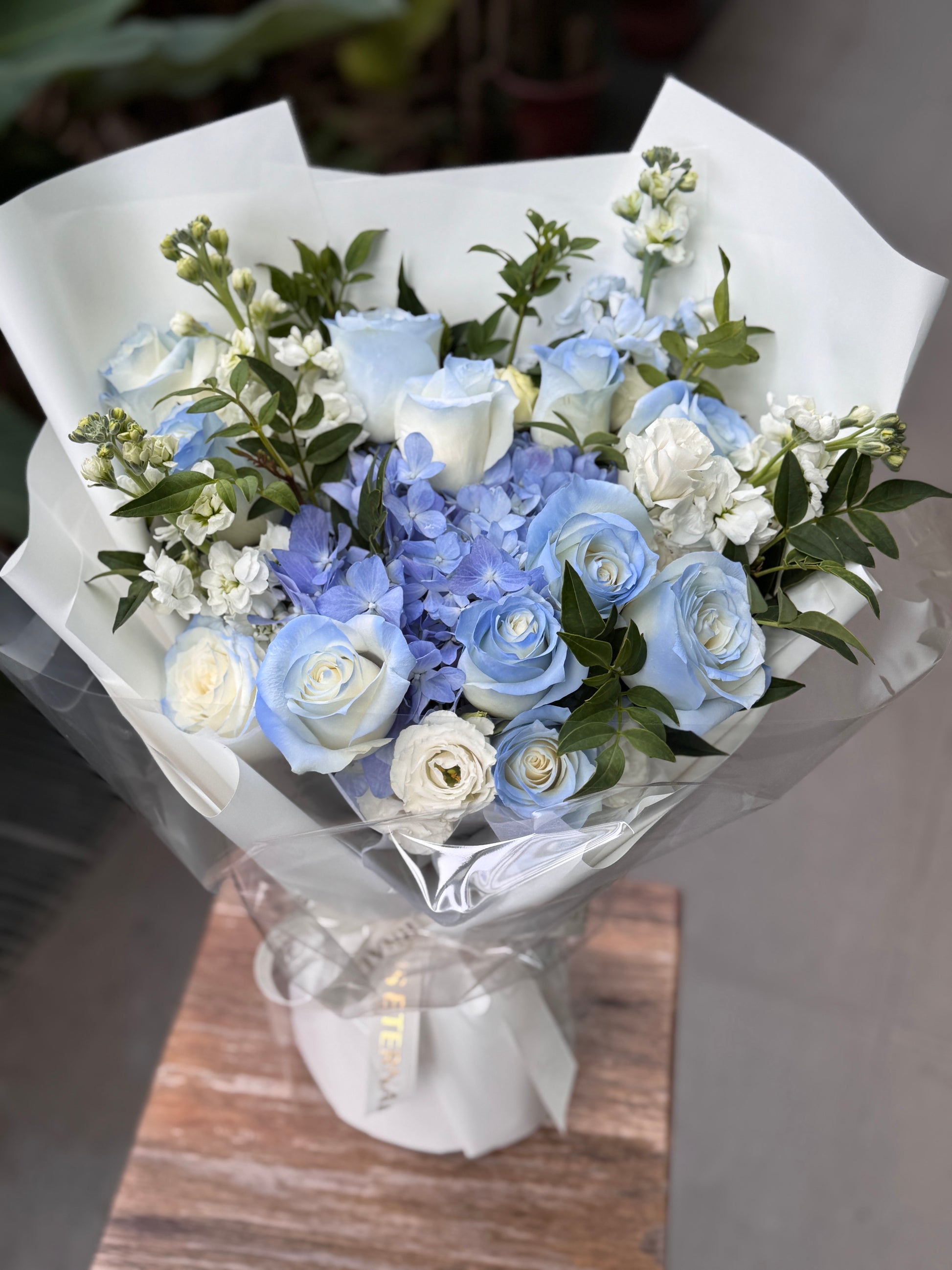 A beautiful bouquet of mix blue bouquet, reminiscent of a work of art from an exclusive, high-end gallery.