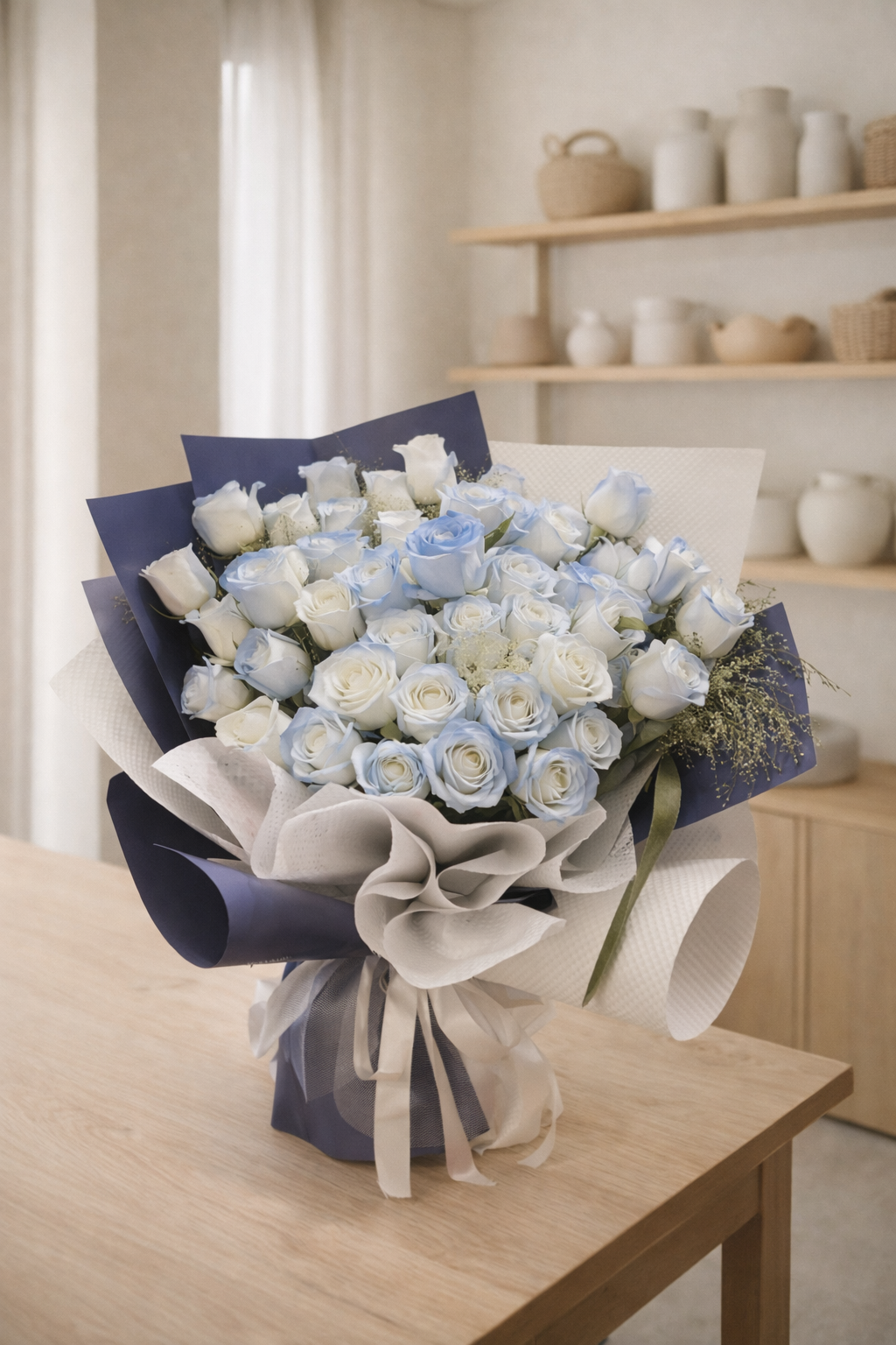 Elevate your floral arrangement game with our FTG 92. This stunning 2 tone blue rose bouquet adds a touch of elegance and sophistication to any occasion. Its unique color combination and expertly crafted design will make a statement that won't go unnoticed. Perfect for weddings, anniversaries, or any special event.