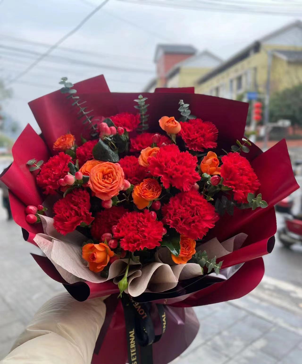 Elevate your space with the exquisite MD 06. Adorned with vibrant red carnations and playful orange roses, this luxurious bouquet brings a touch of sophistication and elegance to any room. Blossoming with beauty, it's the perfect statement piece for those seeking a tasteful and exclusive touch.