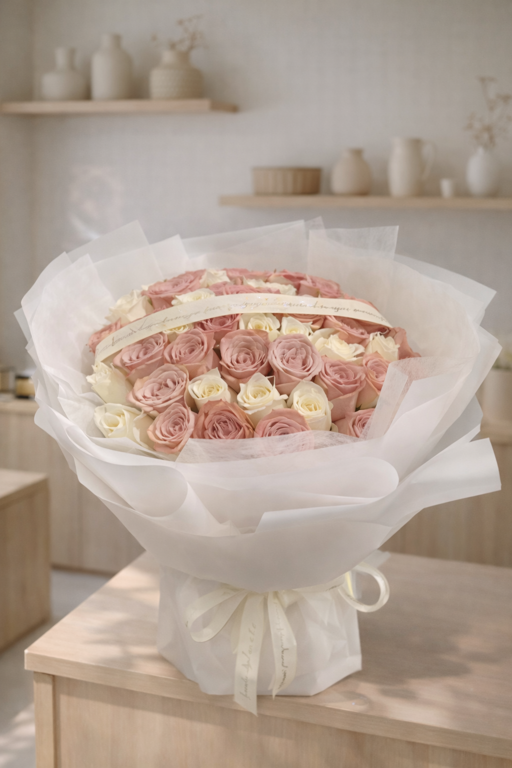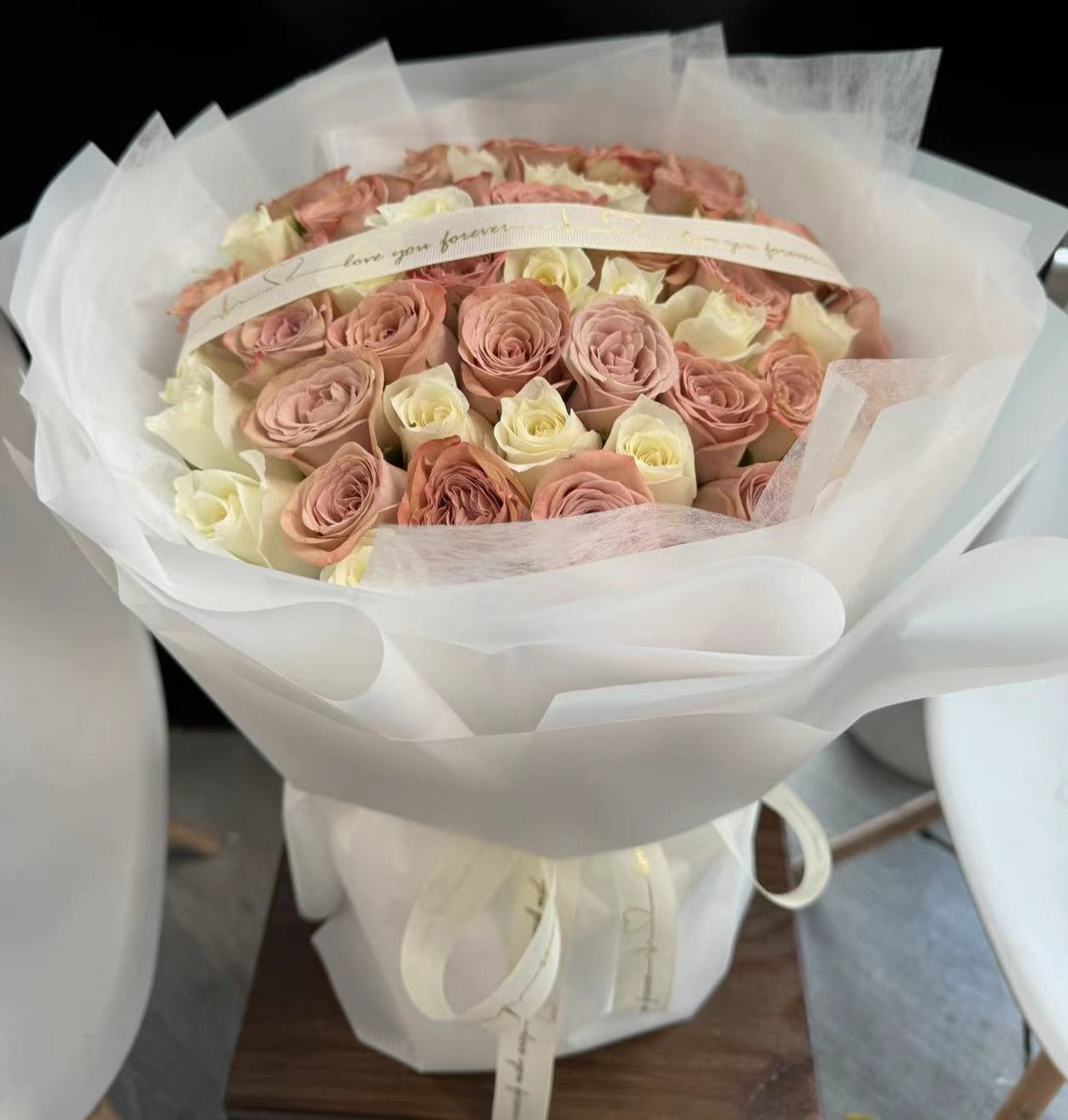 "Add some whimsy to your day with our FTG 76 bouquet, featuring a charming mix of white and dusty pink roses. Perfect for any occasion, this bouquet is sure to bring a smile to your face (and to anyone who receives it!) Turn your day from ordinary to extraordinary with the FTG 76.